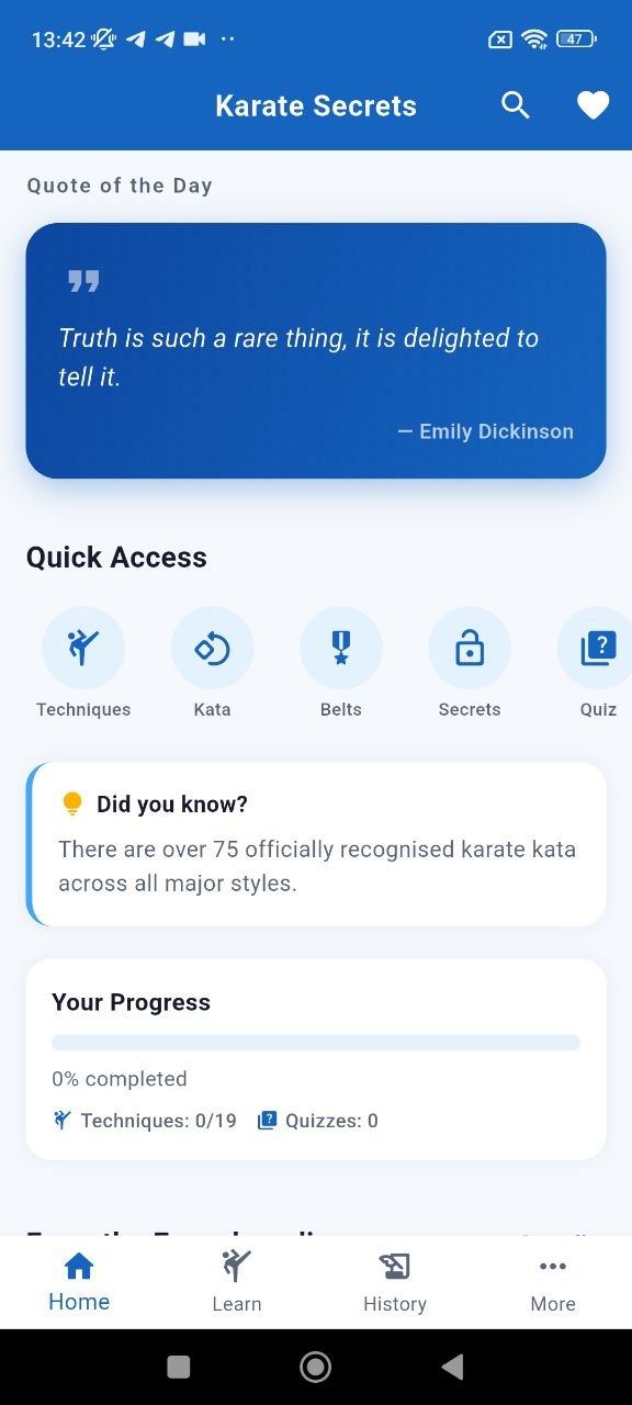Karate Secrets is not just a list of terms. It is structured like a clean learning system: quote of the day, quick access modules, progress blocks, techniques, kata lists, belt ranks, quizzes, secrets, and encyclopedia access.